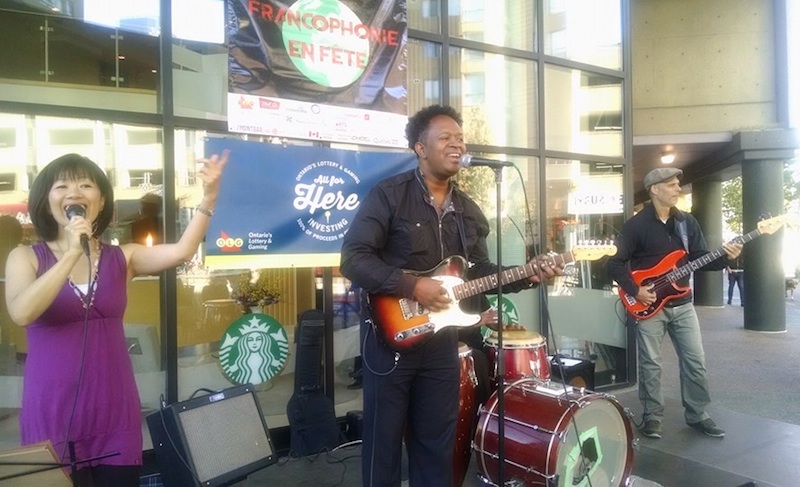 土曜のライブは夕方と夜の2カ所だったんだけど、最初はフレンチ系のイベントでRadisson Hotelの前。バンド全体では一度もリハしてなかったこともあって、キーボードは弾かずにボーカルだけに専念!