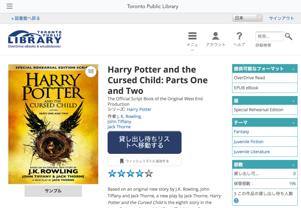 そしてとりあえず無難にハリーポッターを検索。新作「ハリーポッターと呪いの子」。