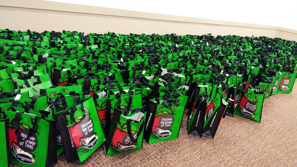 ボランティア約20名で、10時から午後3時までひったすら袋にサンプルやチラシを詰めまくりました。