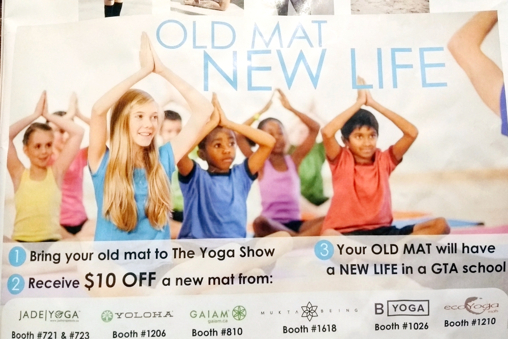 古いマットを小学校へ寄付すると、該当ブースでヨガマットが10ドルオフで買えますよ!というもの。